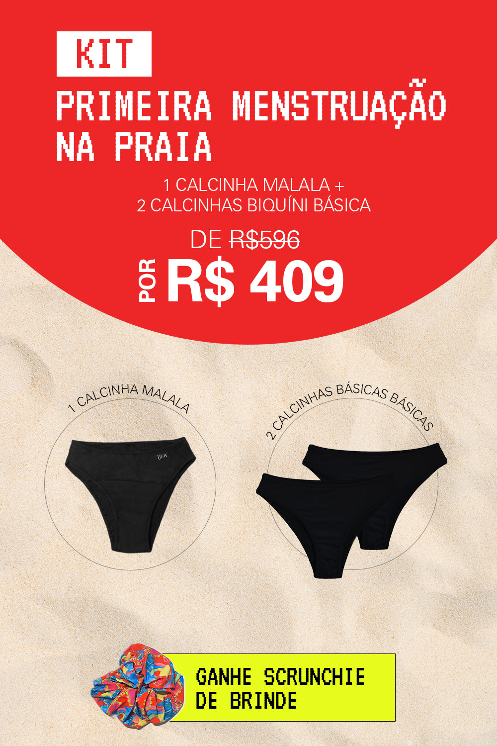 O Kit Primeira Menstruação na Praia foi criado para oferecer segurança, conforto e tranquilidade nos primeiros ciclos, unindo peças para a água e para o dia a dia. É a porta de entrada perfeita para viver a menstruação com mais liberdade desde cedo.