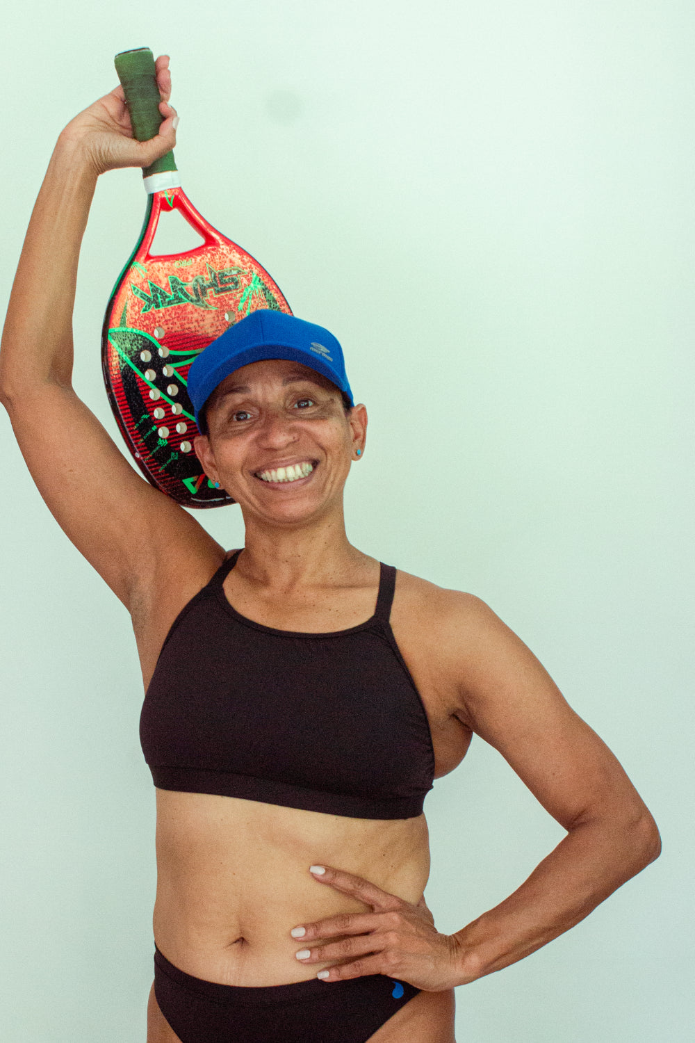 Inspirada por sua trajetória, a Herself criou com Gi o Top Sunkini, pensado para unir performance, conforto e liberdade de movimento dentro e fora da água.