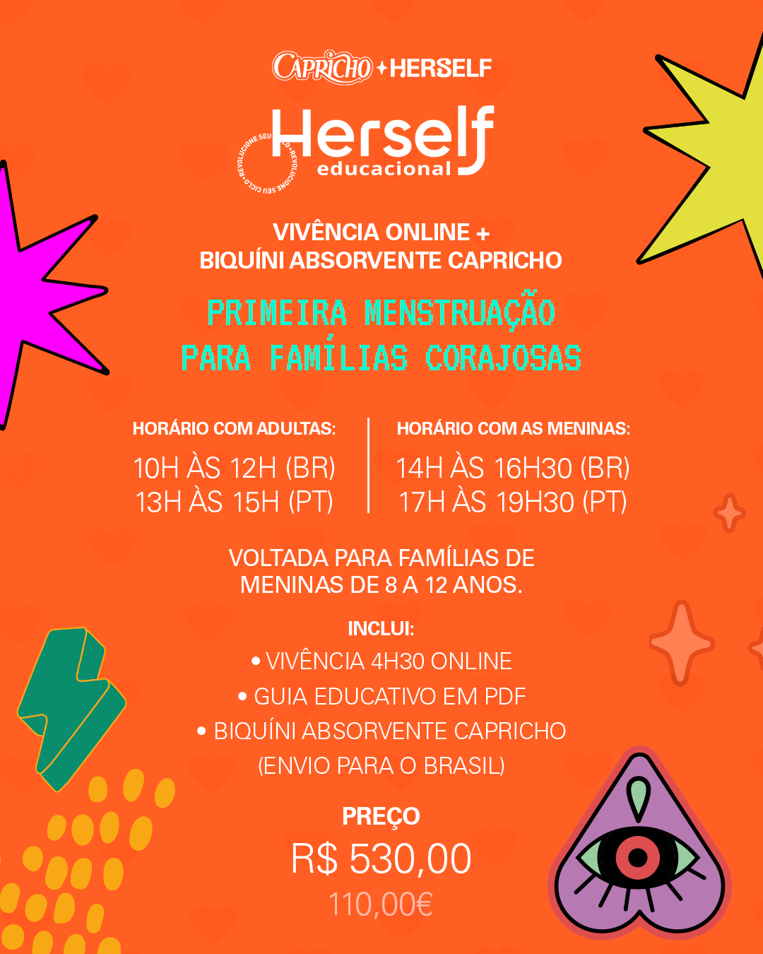Além disso, ganhe no pacote da vivencia a Calcinha de Biquíni Absorvente Básica da collab Herself & Capricho, pensada para viver a melhor experiência nas primeiras menstruações. Disponível em preto essa peça oferece proteção discreta e confortável para usar na água, com a tecnologia Herself que evita vazamentos.
